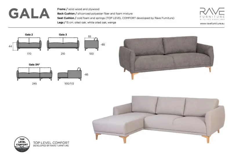 Gala sohvassa on kiinteät tyynyt. Rungon materiaali massiivipuuta ja vaneria.