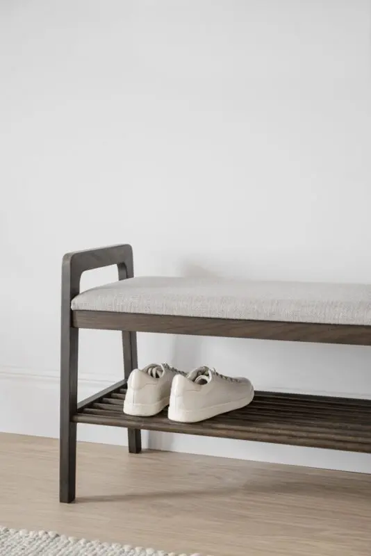 Inverness eteissarjan penkki massiiviruskeaksi lakattua tammea OEKO-kankaalla on käytännöllinen yhdistelmä penkkiä ja kenkähyllyä.