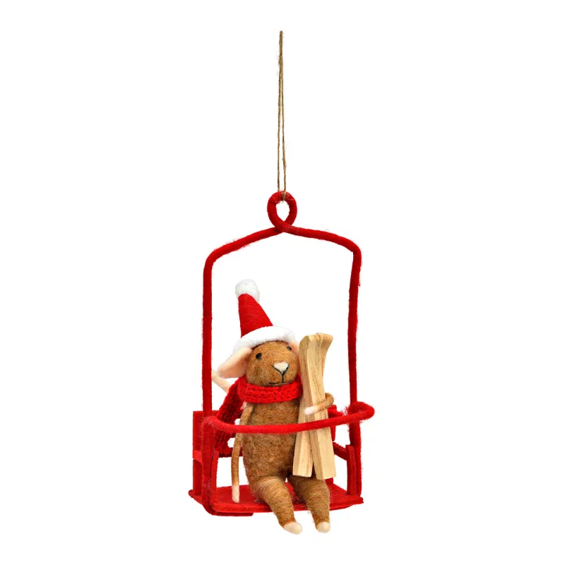 Villasta huovutettu koriste, hiiri istuu tuolihississä sukset kainalossa.