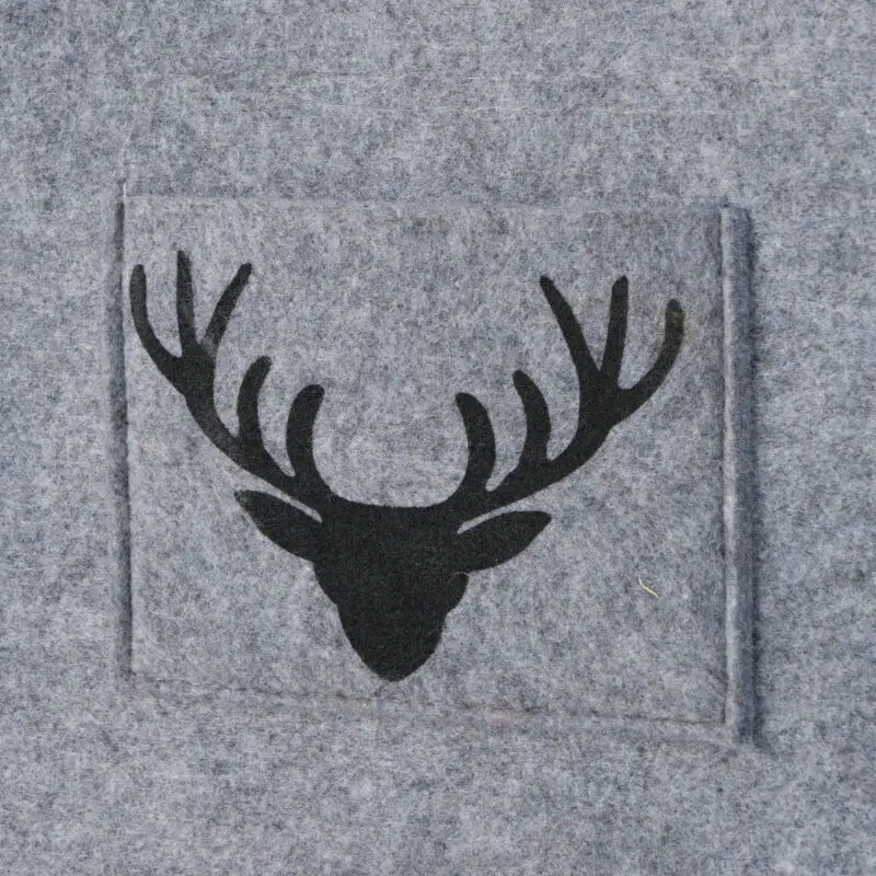 Kori on väriltään harmaa jossa tummemman harmaalla peuran kuva, kahvat ovat luonnon väristä puuta. Materiaali 100 % polyesteri.