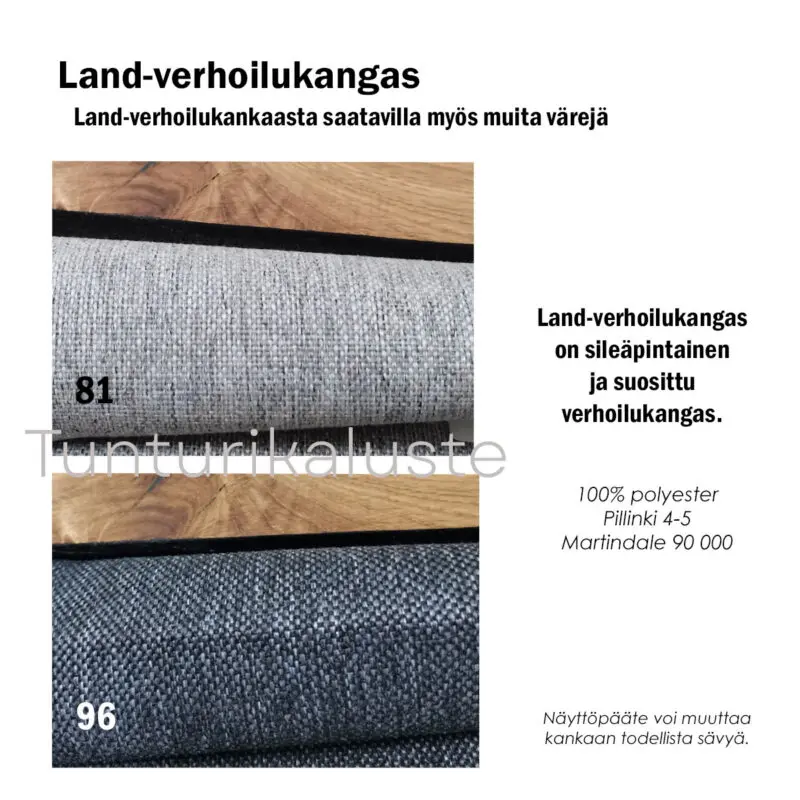 Verkkokaupastamme valittavissa kaksi suosittua verhoilukangasta, Land sekä Modena. Nämä kankaat ovat keskenään saman hintaluokan kankaita.