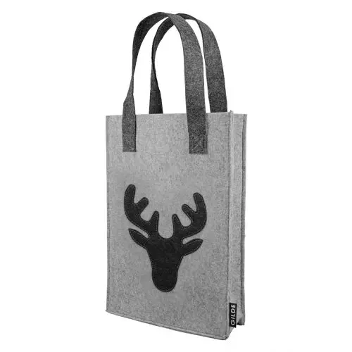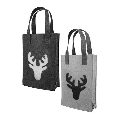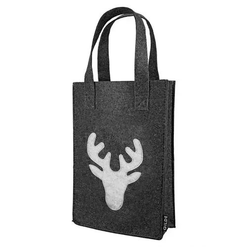 Huopamainen olkalaukku sopii niin lahjapussukaksi kuin käsilaukuksi tai tavaroiden säilytykseen. Peuran pää koristaa laukkuja. Laukkua on kahta väriä, vaaleanharmaa tai tummanharmaa. Muista mainita tilatessa kumman värin haluat. Materiaali 100 % polyesteri.