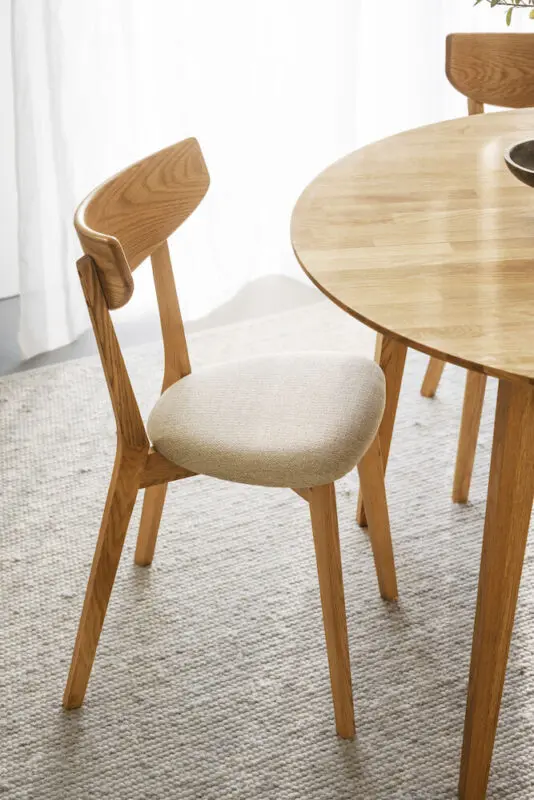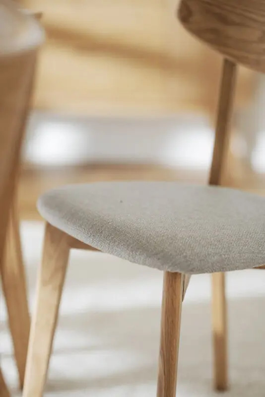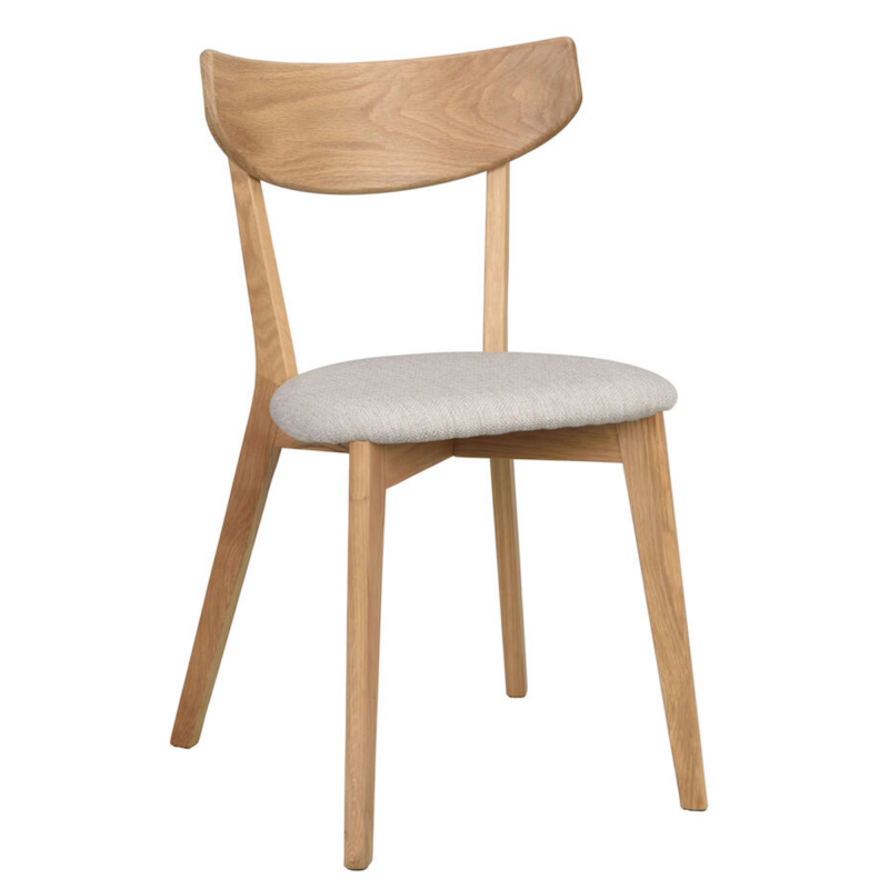 Rowicon klassisen kaunis ja ajaton Ami-ruokatuoli, jossa tyylikäs lakattu tammirunko yhdistettynä beige-harmaaseen kangasverhoiltuun istuimeen.