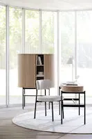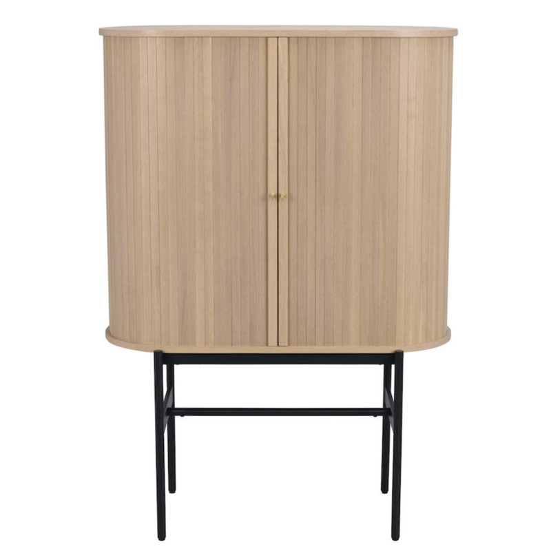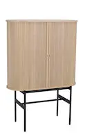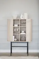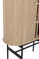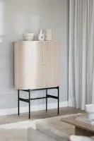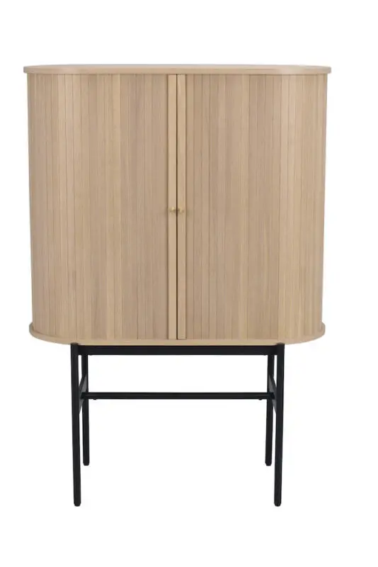 Rowico Haddington ovikaappi, jossa sivulle liukuvat ovet. Pyöristetty muotokieli yhdistettynä tyylikkäisiin mustiin metallijalkoihin antavat kaapille kauniin ilmeen - tämä senkki on varma katseenvangitsija!