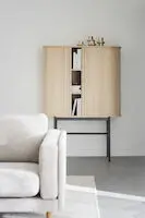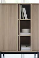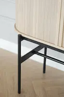 Rowico Haddington ovikaappi, jossa sivulle liukuvat ovet. Pyöristetty muotokieli yhdistettynä tyylikkäisiin mustiin metallijalkoihin antavat kaapille kauniin ilmeen – tämä senkki on varma katseenvangitsija!