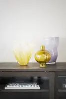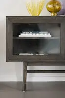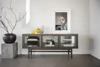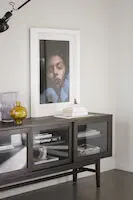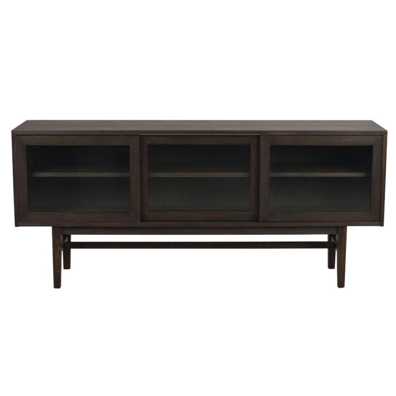 Tyylikäs Rowico Haxelton senkki käytännöllisillä liukuovilla. Ovissa lasit.