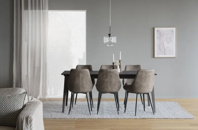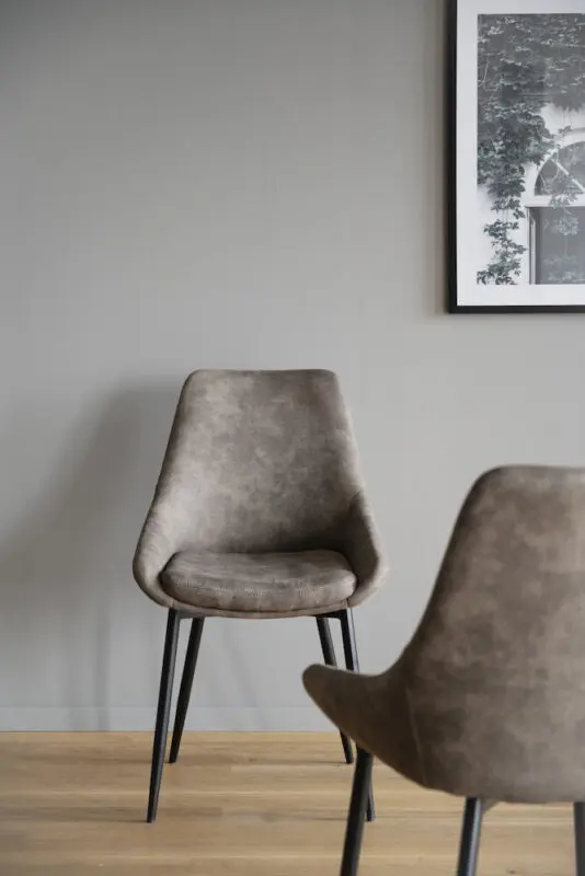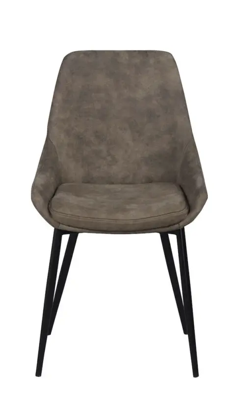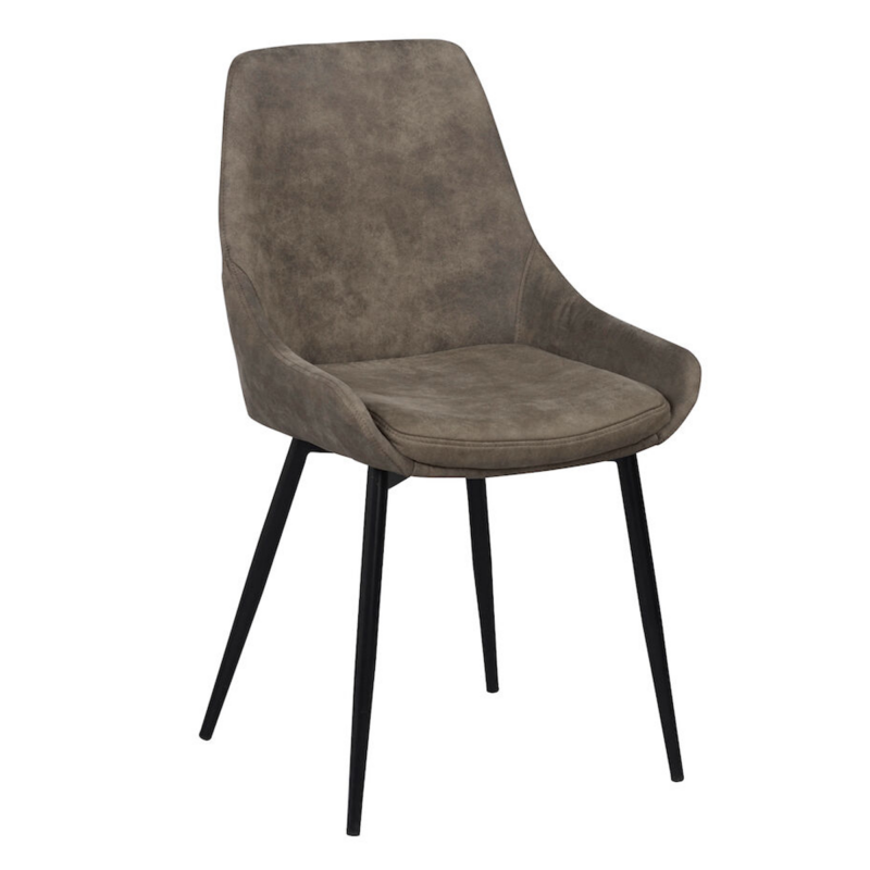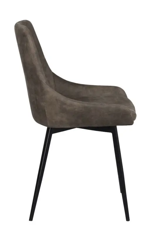 Rowico Sierra-ruokailutuoli, jossa verhoiluna tummanbeige mikrokuitukangas. Kangas on sileäpintainen ja kestävä. Tuolin jalat on pulverimaalattua metallia.
