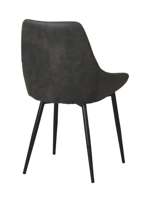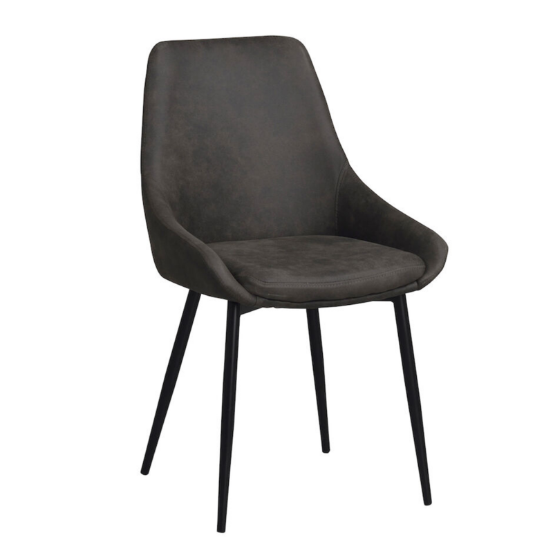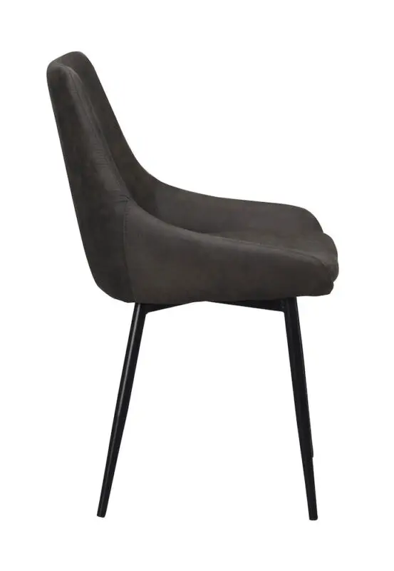 Rowico Sierra-ruokailutuoli, jossa verhoiluna harmaa mikrokuituinen verhoilukangas. Kangas on sileäpintainen ja kestävä. Tuolin jalat on pulverimaalattua metallia.