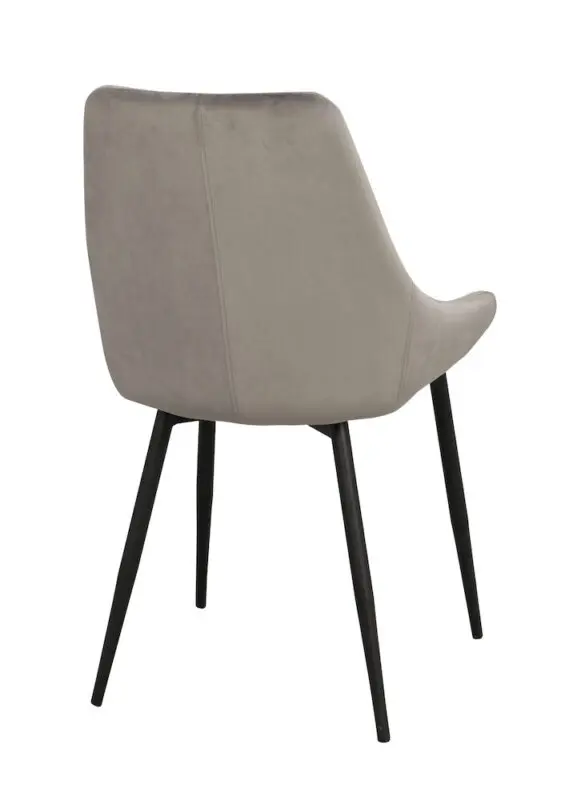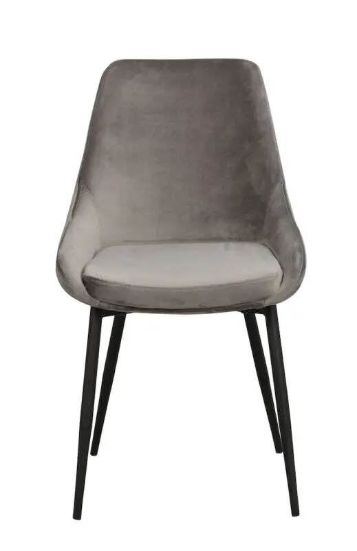 Rowico Sierra-ruokailutuoli, jossa verhoiluna harmaa samettiverhoilu. Kangas on sileäpintainen ja kestävä. Tuolin jalat on pulverimaalattua metallia.