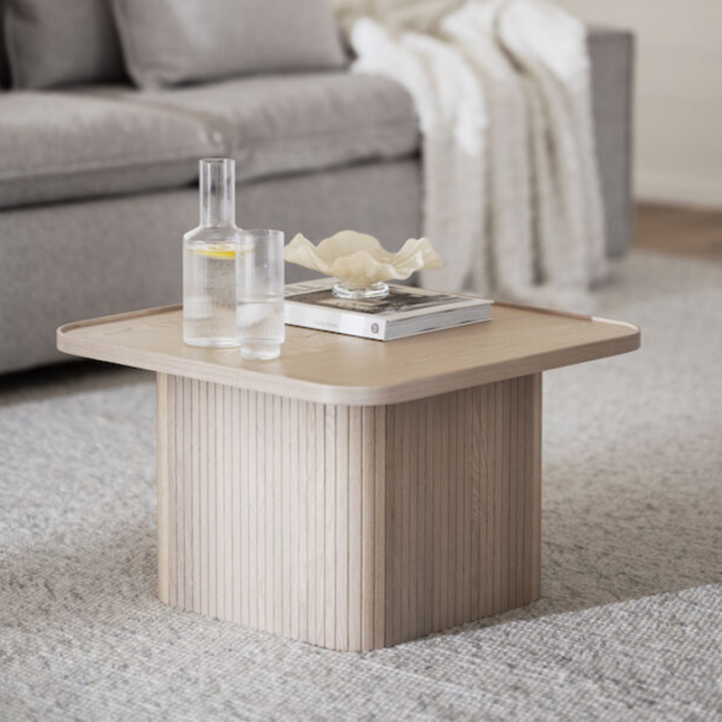 Tyylikäs ja moderni Rowico Sullivan sohvapöytä, jonka massiivitammisessa jalustassa pystysuuntainen “rimoitus”. Kansi tammiviilua.