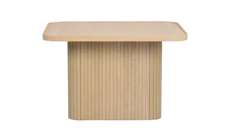 Tyylikäs ja moderni Rowico Sullivan sohvapöytä, jonka massiivitammisessa jalustassa pystysuuntainen "rimoitus". Kansi tammiviilua.