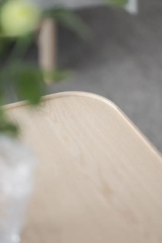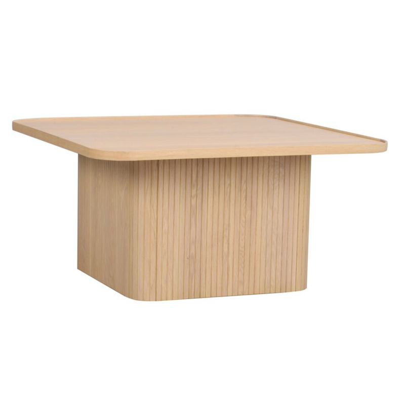 Tyylikäs ja moderni Rowico Sullivan sohvapöytä, jonka massiivitammisessa jalustassa pystysuuntainen "rimoitus". Kansi tammiviilua.