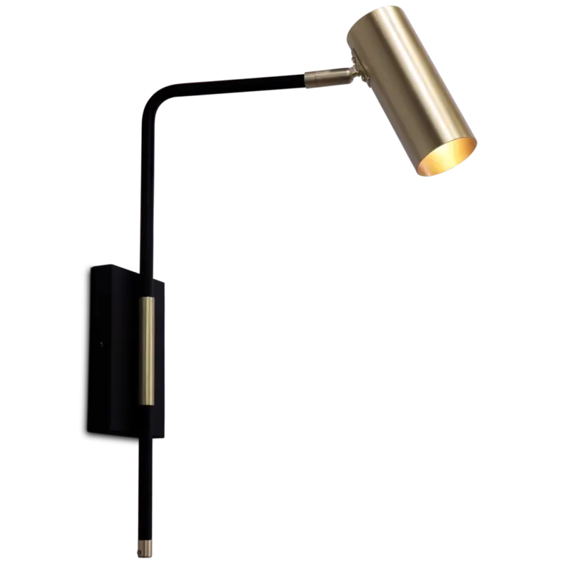Tyylikäs harjatun mattamessingin ja mustan värinen kapea seinävalaisin, jolle on helppo löytää paikka. Valo lankeaa kapean kuvun sisältä estäen häikäistymisen ja luoden valokeilan.