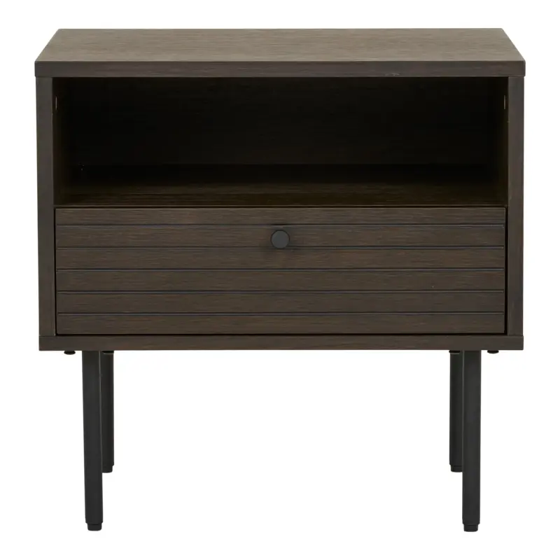 Sivupöytä/yöpöytä Kyoto 1 laatikolla tumma tammiviilu, mustat jalat