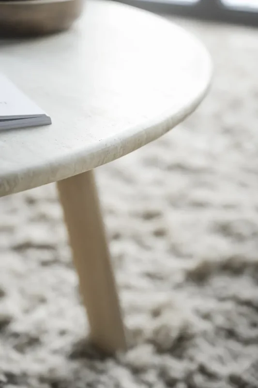 Travertiini on eräänlainen kalkkikivi, jolla on eloisa rakenne, joka antaa pöydälle luonnollista kauneutta ja ajan myötä ainutlaatuista patinaa – joka päivä voit löytää uuden yksityiskohdan pöytälevystä. Pöydän pehmeä pyöreä muotoilu luo mukavan kontrastin eloisaan ja tukevaan kivitasoon.