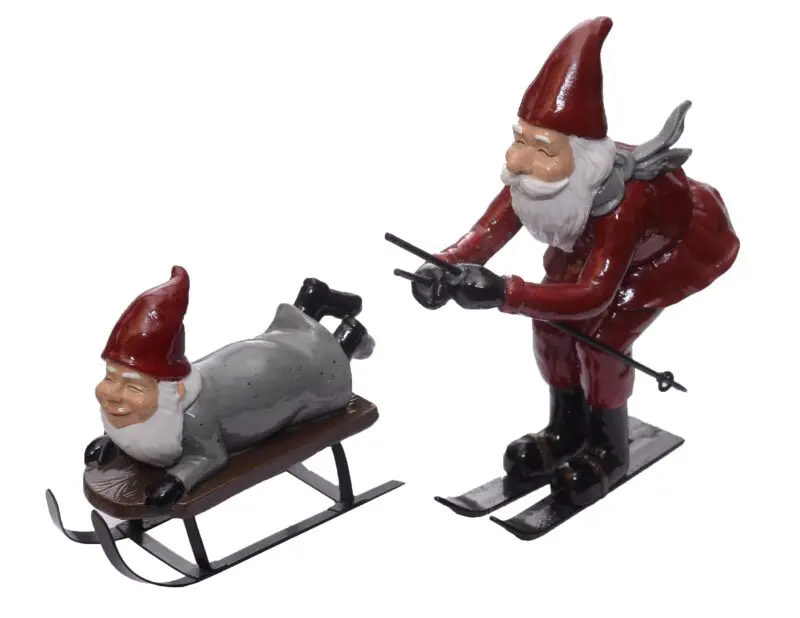 Tonttu mäen laskussa kelkalla. Kuvasta poiketen meidän verkkokaupasta saatavilla vain kelkkailevaa tonttua.
