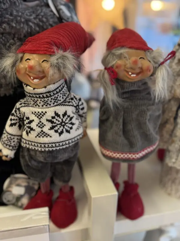 Nämä omilla jaloilla seisovat tontut ovat 60cm korkeita hiippalakin kärjestä varpaisiin. Muorilla on harmaa villamekko päällä ja vaarilla norjalaisneule. Kädet on liikuteltavissa eri asentoon.