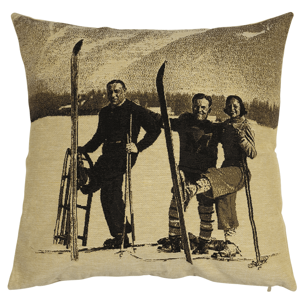 Tämä hauska vanha kuva tuo mieleen muistoja. Laskettelijat rivissä vanhoissa vaatteissaan tuo mökkiisi tai kotiisi ihanan tunnelman. Tyyny sopii niin olohuoneeseen katseenvangitsijaksi tai makuhuoneen sängylle tai vaikka eteisen penkille.