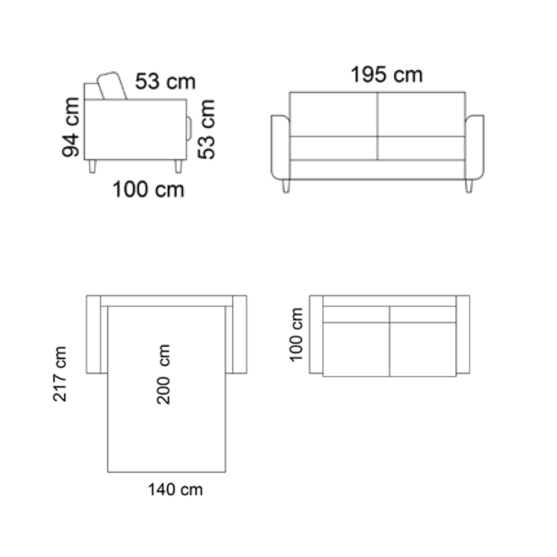 - Leveys 195cm, syvyys 100cm, korkeus 94cm